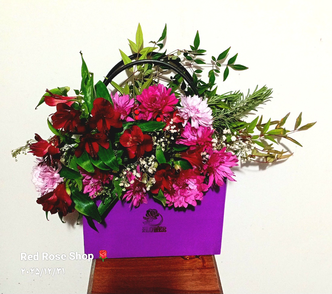 در گل فروشی رز قرمز کرج/Red Rose Shop تنوع زیادی در بگ فلاورها از نظر شکل و طراحی،رنگ و اندازه کیف گل ها موجود میباشد.