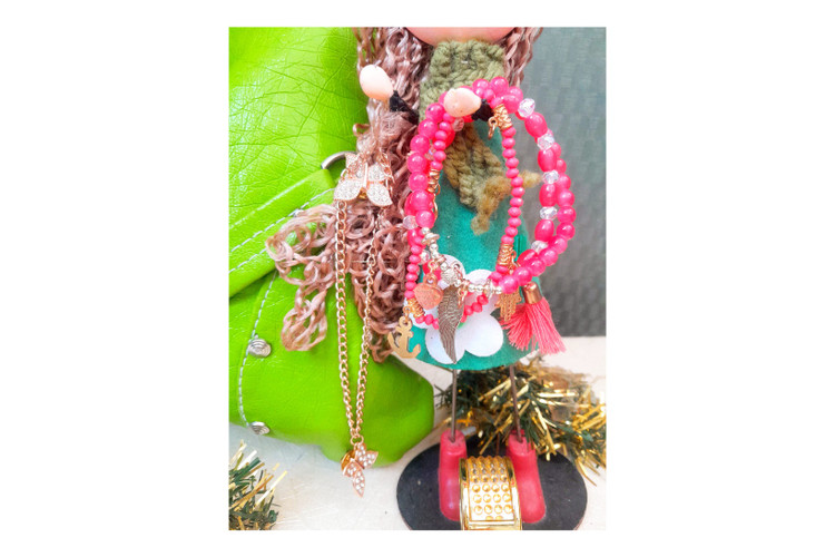 محتویات: کیف،مجسمه عروسکی،دستبند مهره ای ۳عدد،مداد چشم،گوشواره،گل سینه گیره سر اکسسوری
