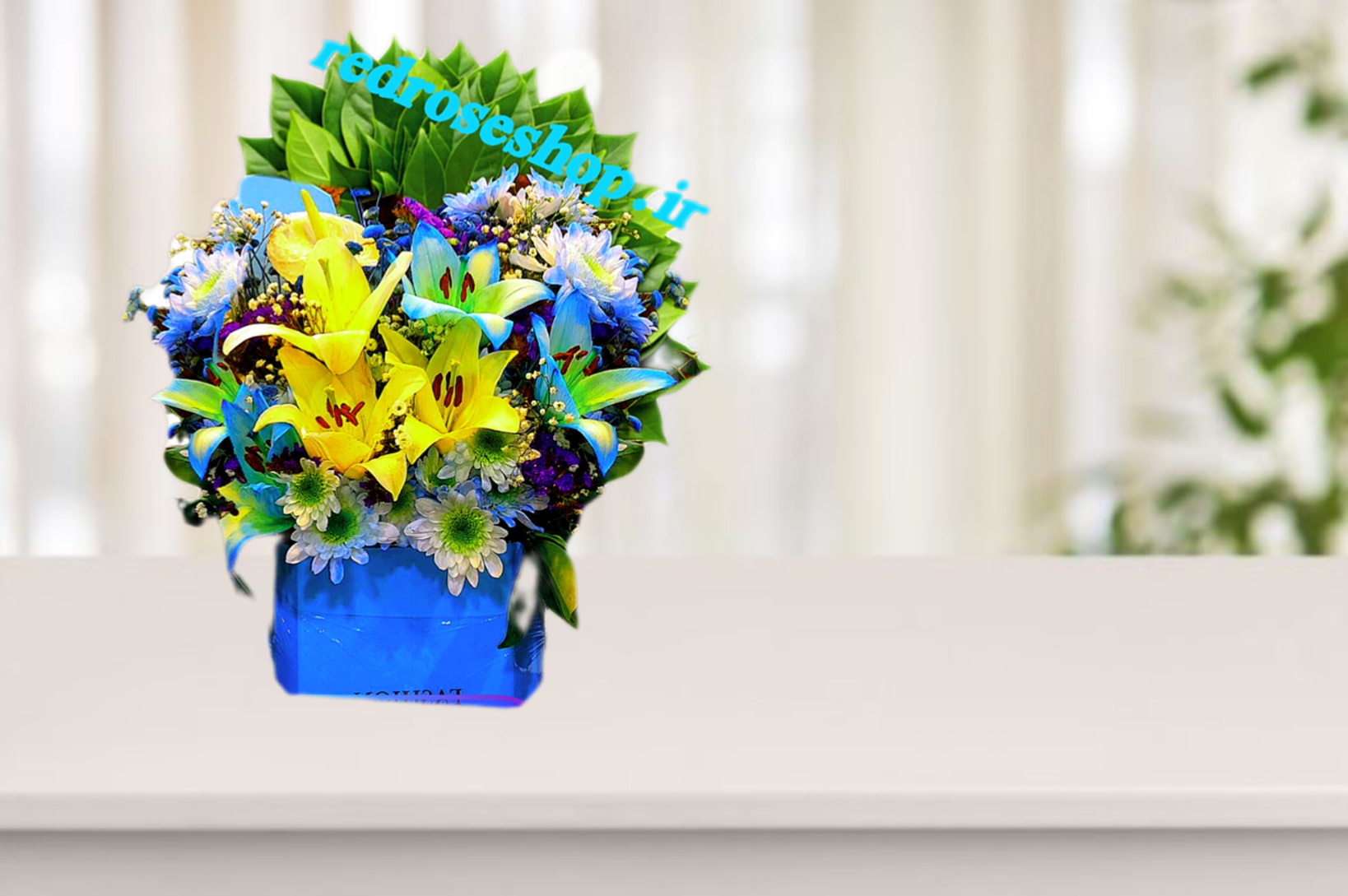باکس گل "آبی نگار" |لیلیوم،اورینتال،داوودی زرد لیمویی و آبی و سفید کد ۳۹۸ در گلفروشی Red Rose Shop/رز قرمز کرج