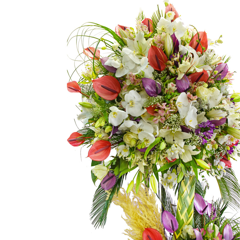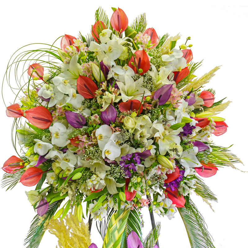 1. آنتریوم 50 شاخه در دو رنگ میباشد. 2. لیلیوم اوریانتال 15 گل میباشد. 3. ارکیده فالانپسیس 75 گل میباشد. 4. رز هلندی 15 شاخه میباشد. 5. آلستر مریا 30 شاخه میباشد. 6. برگ های تزئینی : برگ سیکاس – برگ لیندا – برگ شمشیری –پامپاس کراس - جیبسی فیلا ( عروس هلندی ) میباشد.
